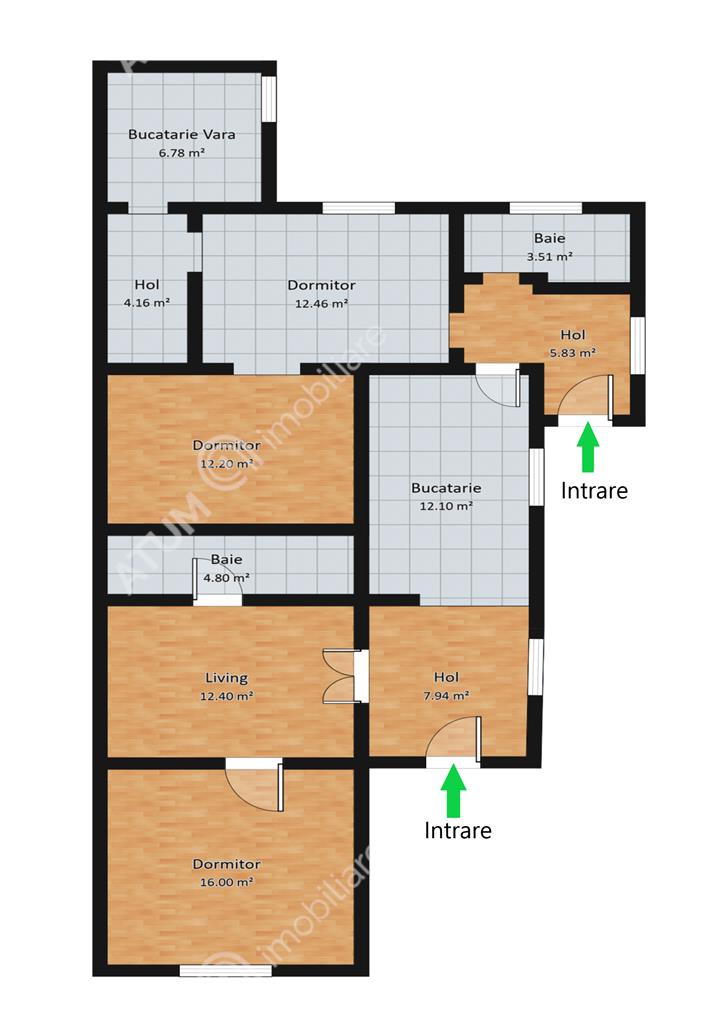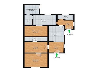 Casa este dispusa pe parter, beneficiaza de 2 intrari separate, si este compusa din 3 dormitoare, living, bucatarie, 2 bai, 2 holuri de acces, si spatiu de depozitare, acestea insumand 99 mp utili. Separat de suprafata utila mai beneficiaza de un pod pe toata suprafata casei si de 2 pivnite in care accesul se face din interiorul casei.