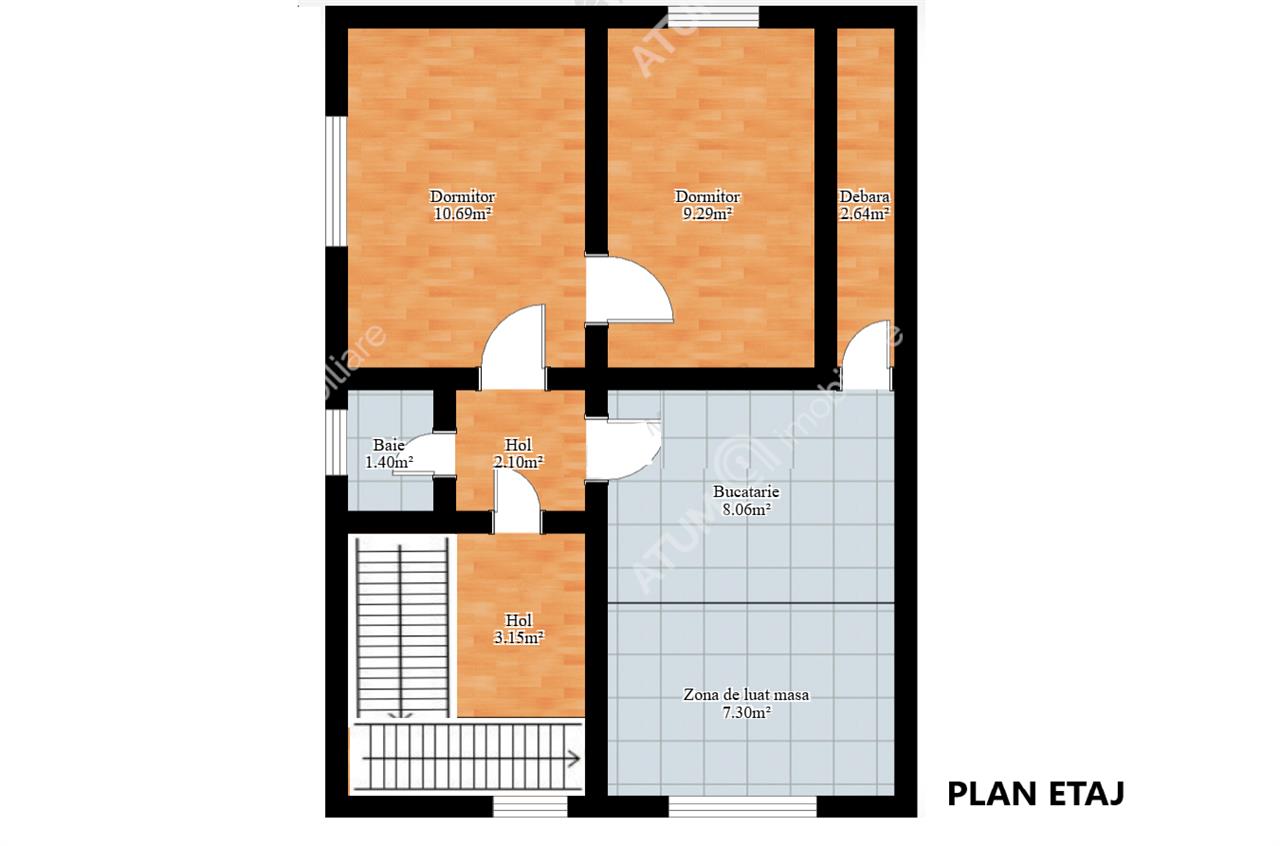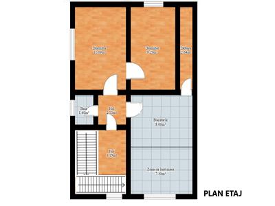 Imobilul este distribuit pe nivel de inaltime S+P+M, fiind compus la parter din: hol de aproximativ 9 mp, bucatarie 11 mp, living 22 mp, dormitor 19 mp, baie 4 mp dotata cu geam de aerisire, la etaj regasim un hol de 5 mp, doua dormitoare de aproximativ 10 mp, o a doua bucatarie de 8 mp, zona de luat masa 7 mp, o debara de 2.5 mp, si o baie de serviciu de 1.5 mp cu geam de aerisire.