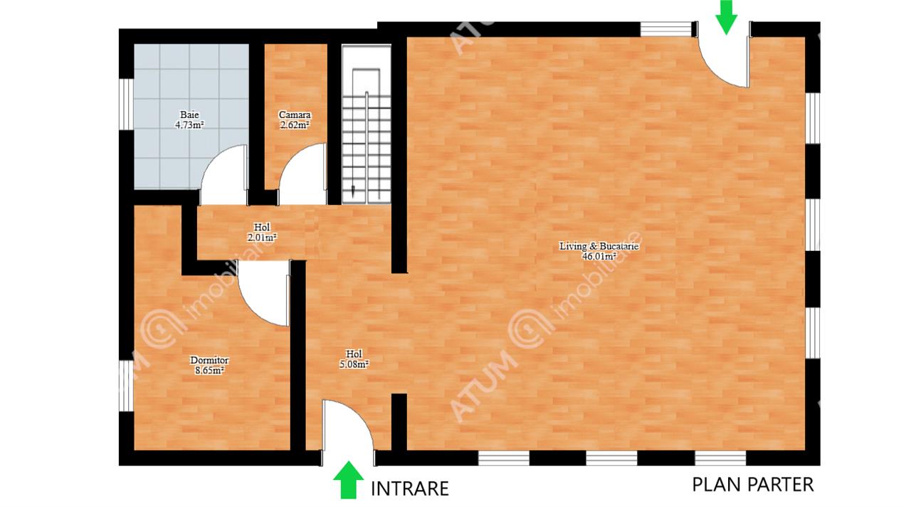 Separat de suprafata utila mai detine la parter doua terase de 9 si 18 mp, iar la etaj un balcon de 2 mp.