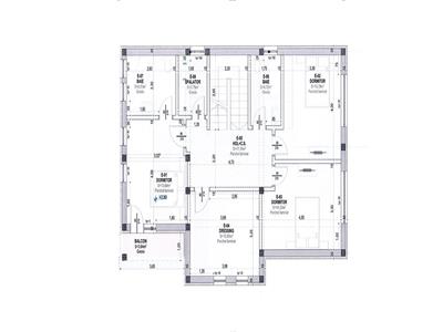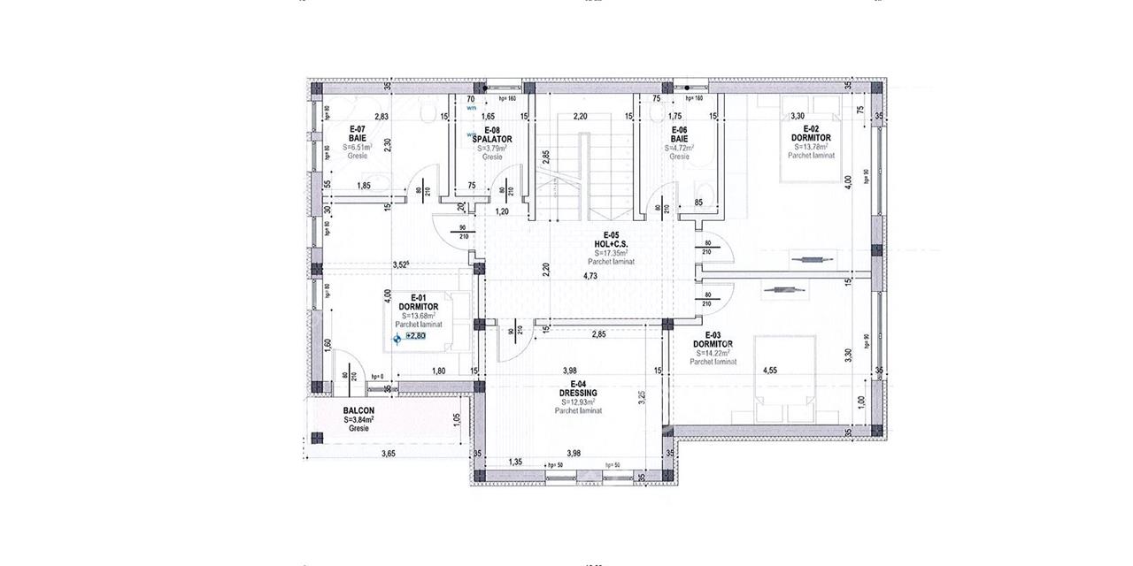 Etajul este zona de odihna si este compus din trei dormitoare, dintre care unul dispune de baie proprie, o a doua baie care deserveste celelalte doua camere, un dressing spatios de 13 mp care poate fi transformat in al patrulea dormitor si un spatiu de depozitare de 3,7 mp.