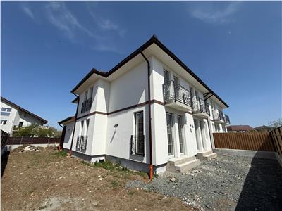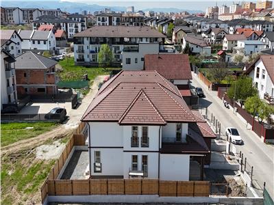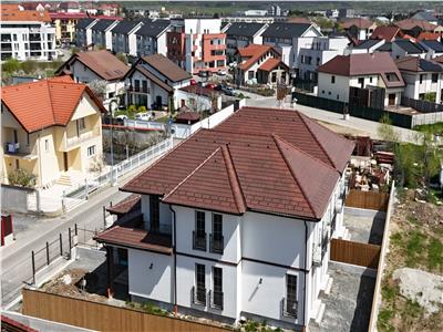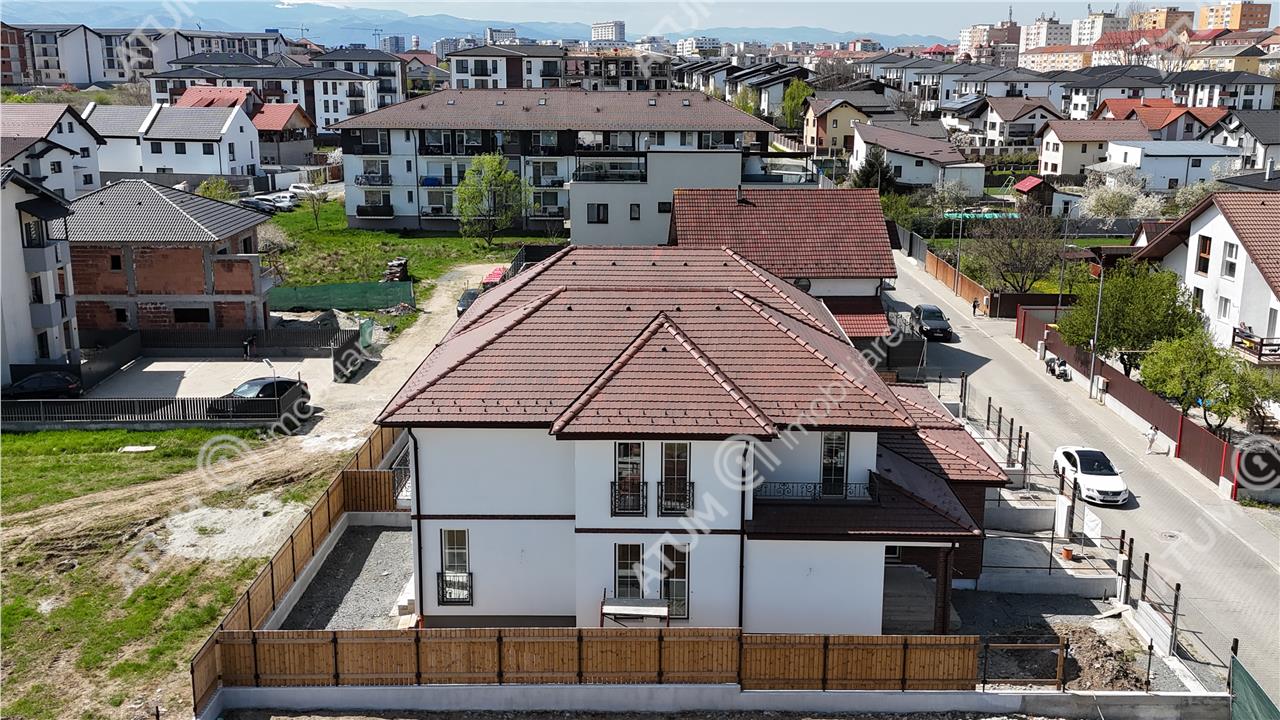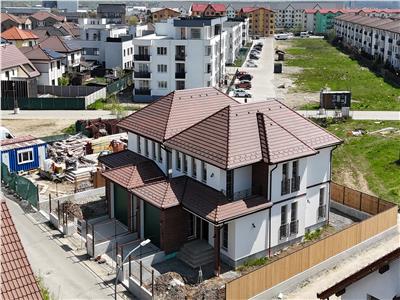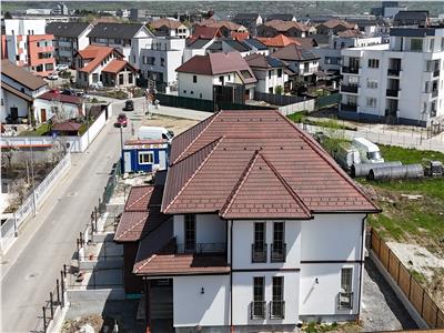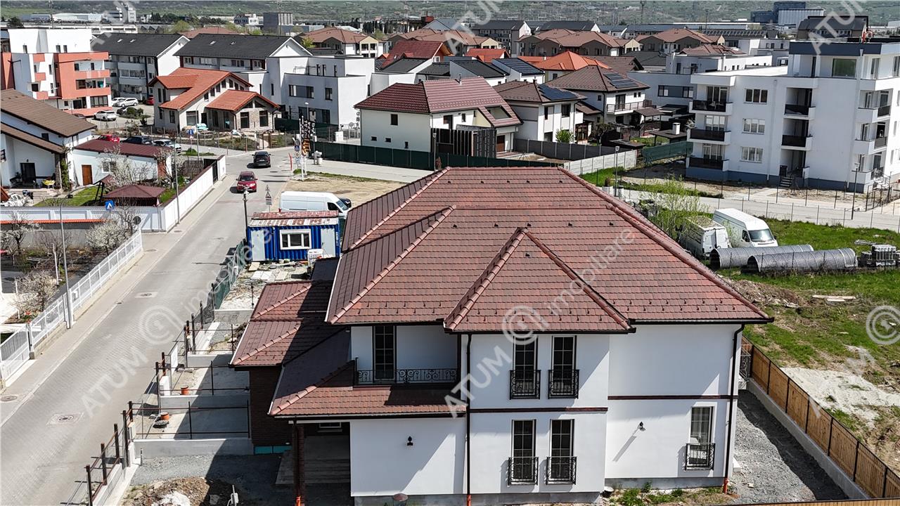Casa este construita din caramida Porotherm Robust, cu ziduri exterioare de 30 cm si interioare de 25 cm, izolatie exterioara din polistiren EPS 200 de 10 cm, decorativa marca STO si caramida decorativa de exterior Klinker. Acoperisul este realizat cu tigla Bramac Reviva si folie anticondens, iar lemnaria din pod este supradimensionata si ignifugata si sistem pluvial marca Bramac racordat la sistemul pluvial stradal . Placa peste parter supradimensionata pentru izolatie fonica, iar placarile tavanului de la etaj sunt cu rigips ignifug, izolat cu vata bazaltica si folie aluminizata lipita perimetral cu banda de etansare, usa de acces pod este termoizolanta cu vata si folie eluminitata.Tamplaria este de aluminiu cu bariera termica, realizata la comanda in doua culori, cu trei foi de sticla si baghete albe, importate din Ungaria. Garajul este pavat cu gresie speciala pentru trafic auto, usa actionata electric marca Hormann, priza pentru incarcare masina electrica si curent trifazic. Centrala termica este Vailant, cu boiler inclus, iar incalzirea in pardoseala este distribuita separat pe fiecare nivel, cu termostate individuale pentru fiecare incapere. Casa dispune de instalatie pentru aer conditionat, sistem audio 4.1 pregatit in living, tablouri electrice separate pentru parter si etaj cu sigurante pentru consumatorii de putere, prize si intrerupatoare montate.