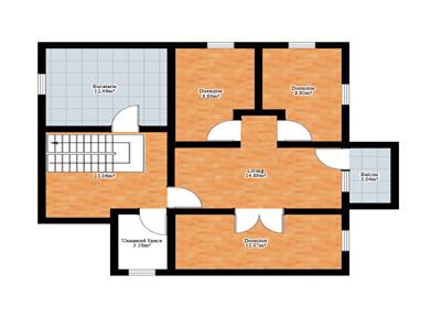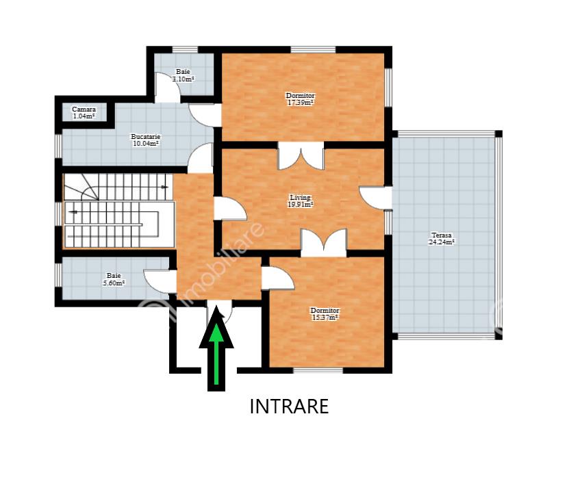 La etaj ( 80 mp utili ) este aceeasi configuratie cu exceptia unui dormitor care a fost impartit in 2 dormitoare pentru copii, iar pe langa suprafata utila, se regaseste si un balcon de 3 mp de unde se pot admira imprejurimile.