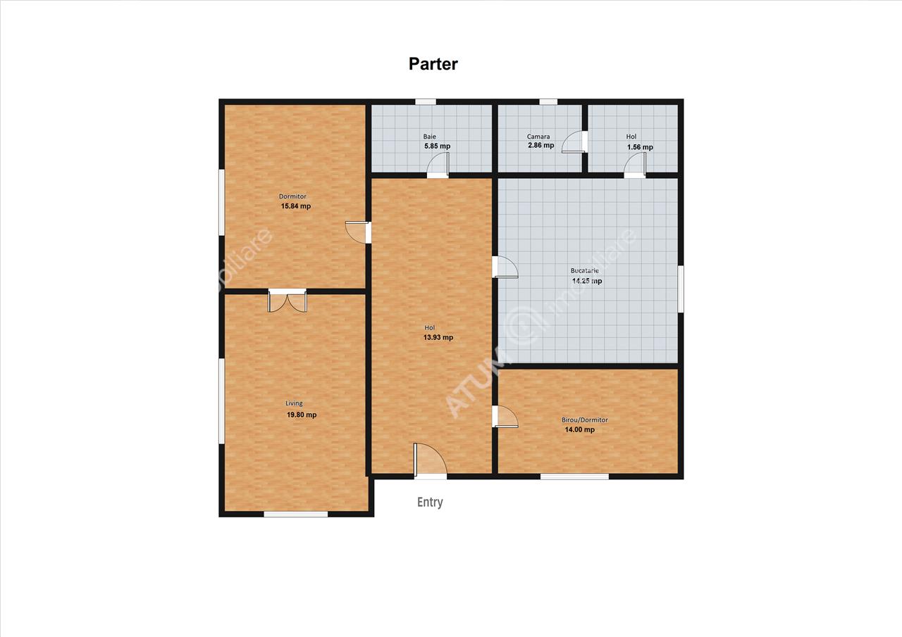 La parter, se intra intr-un hol de acces care duce catre un living spatios, o camera ce poate fi folosita ca birou (datorita pozitionarii aproape de intrare), un dormitor sau camera de oaspeti, o bucatarie luminoasa cu acces catre o camara practica, precum si o baie completa.