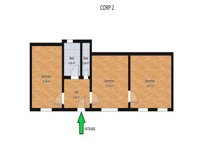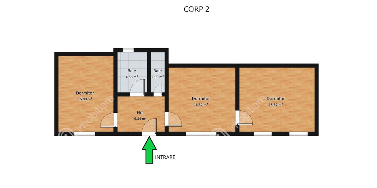 Corpul 2 este compus din 3 dormitoare in suprafata de 15.88 mp, 16.32 mp respectiv 18.37 mp, hol de 6.37 m, baie de 4.56 mp si baie de serviciu 2.09 mp.