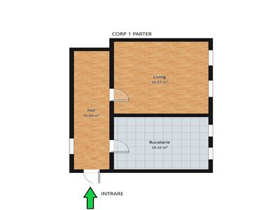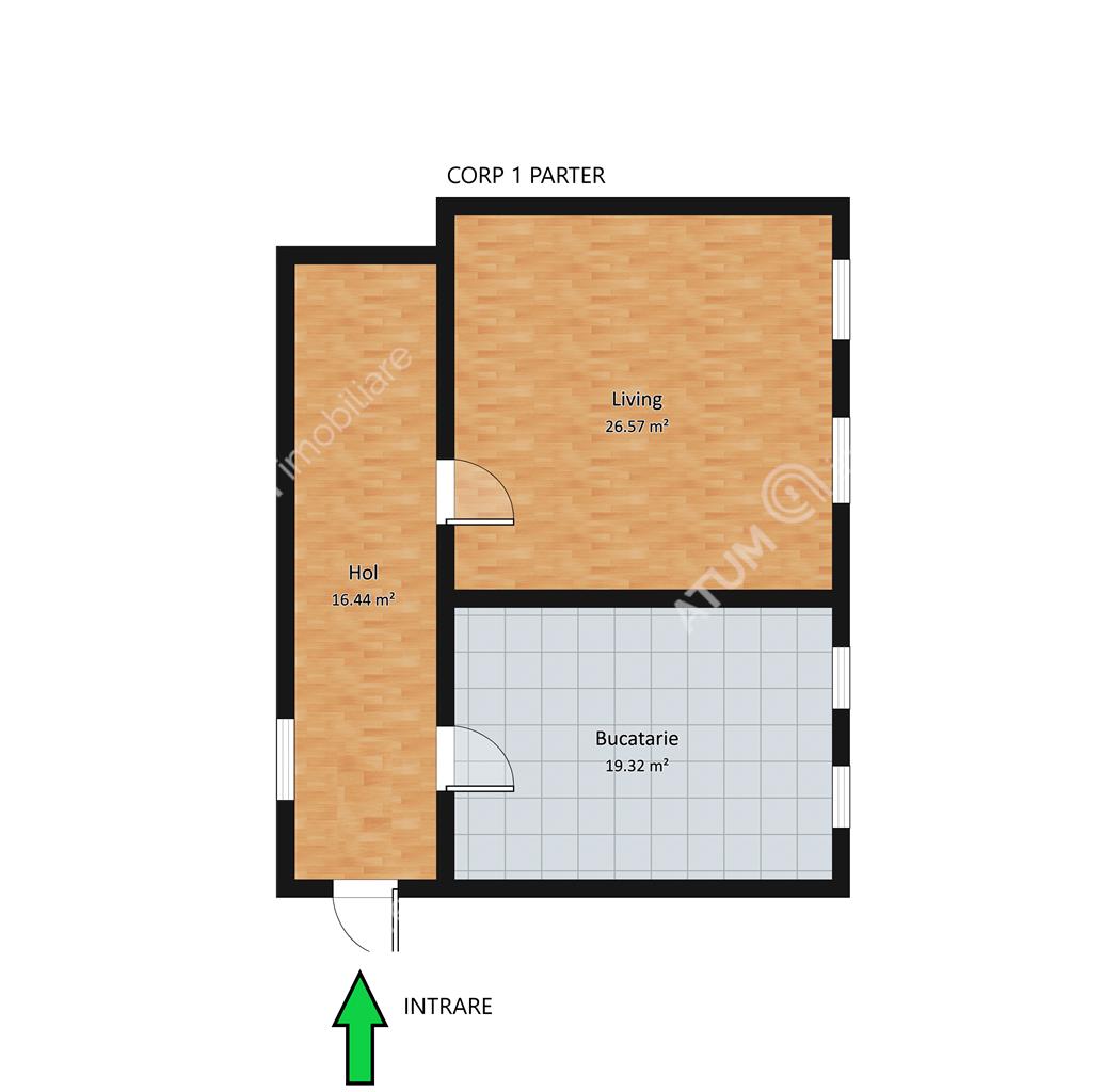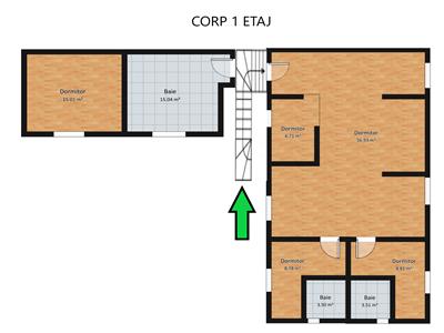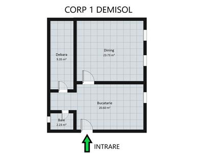 Corpul 1 este compartimentat pe doua nivele si distribuit astfel: la parter se afla un hol de acces generos de 16.5 mp, cu spatiu pentru cuier si pantofar, living de 23.68 mp, bucatarie de 17.50 mp si casa scarilor care duce la etaj. Aici gasim camera cu spatiu generos de 66.08 mp ce este compartimentata avantajos pentru loc dormit si semineu, in continuarea acestuia sunt inca doua dormitoare de 8.78 mp respectiv 8.80 mp fiecare cu baie proprie de 3.50 mp, la demisol gasim inca o bucatarie de 20.60 mp, un spatiu de dining de 23.73 mp, o debara de 9.35 mp si o baie 2.23 mp.