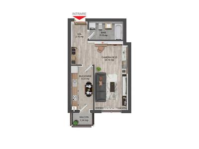 Proprietatea are o suprafata utila de 40 mp si ofera un spatiu bine organizat: living generos cu zona de dormit (24.14 mp), bucatarie separata cu loc de dining (8.23 mp), baie spatioasa (5.23 mp) si hol functional cu spatii de depozitare. Balconul de 3.34 mp completeaza confortul locuintei, avand acces direct din camera principala.