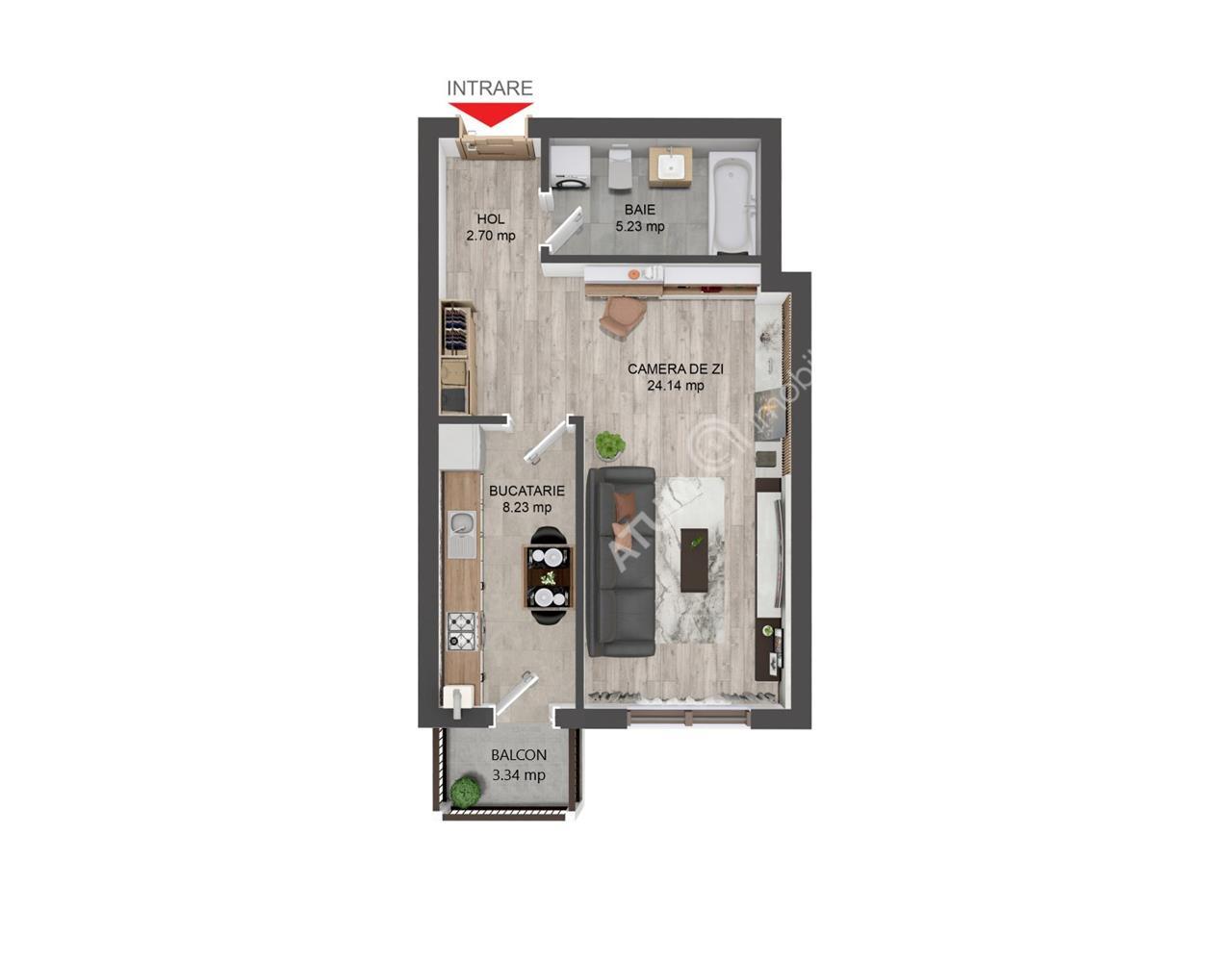 Locuinta dispune de o suprafata utila de 40 mp si este compartimentata eficient in camera de zi/dormitor de 24.14 mp, bucatarie inchisa cu loc de luat masa de 8.23 mp, hol de 2.7 mp cu spatiu pentru depozitare si baie de 5.23 mp. In completare, proprietatea beneficiaza de un balcon de 3.34 mp, cu acces din zona de dormit.
