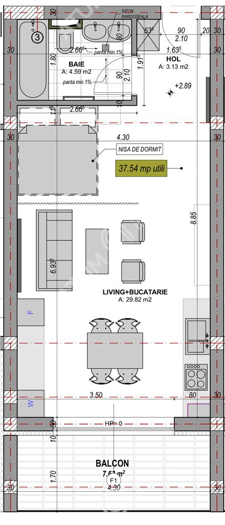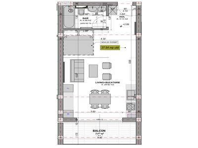 Locuinta are o suprafata utila de 37.5 mp si este compartimentata astfel: la intrare un hol de 3 mp, baie cu cada si sistem de aerisire de 4.5 mp si o camera open-space de 30 mp.