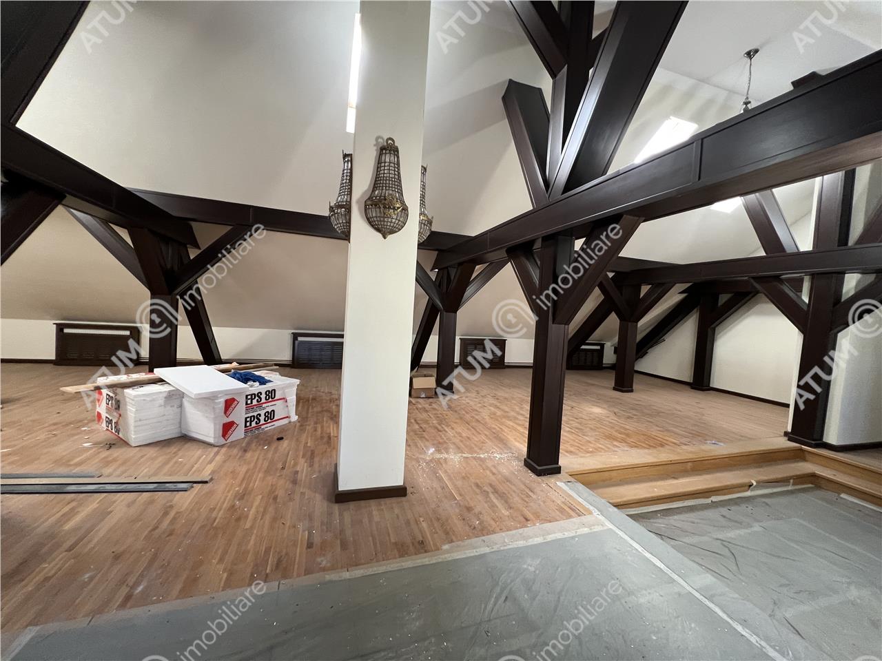 Printre modificarile aduse spatiului mentionam: captusirea podului cu vata minerala pentru termoizolare si confort si pe timpul verii cat si al iernii, instalarea unor geamuri Velux ce ofera lumina naturala, instalatii sanitare, electrice si de canalizare, utilarea celor 2 bai, instalarea unui lift pentru a facilita accesul la etajul superior, montarea de prize si intrerupatoare, dar si montarea unor usi, a parchetului si a tamplariei de lemn masiv. De asemenea, stalpii care ajuta la recompartimentarea biroului central de 169 mp au fost placati cu lemn masiv si redau un aspect de inalta calitate intregului spatiu.
