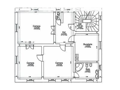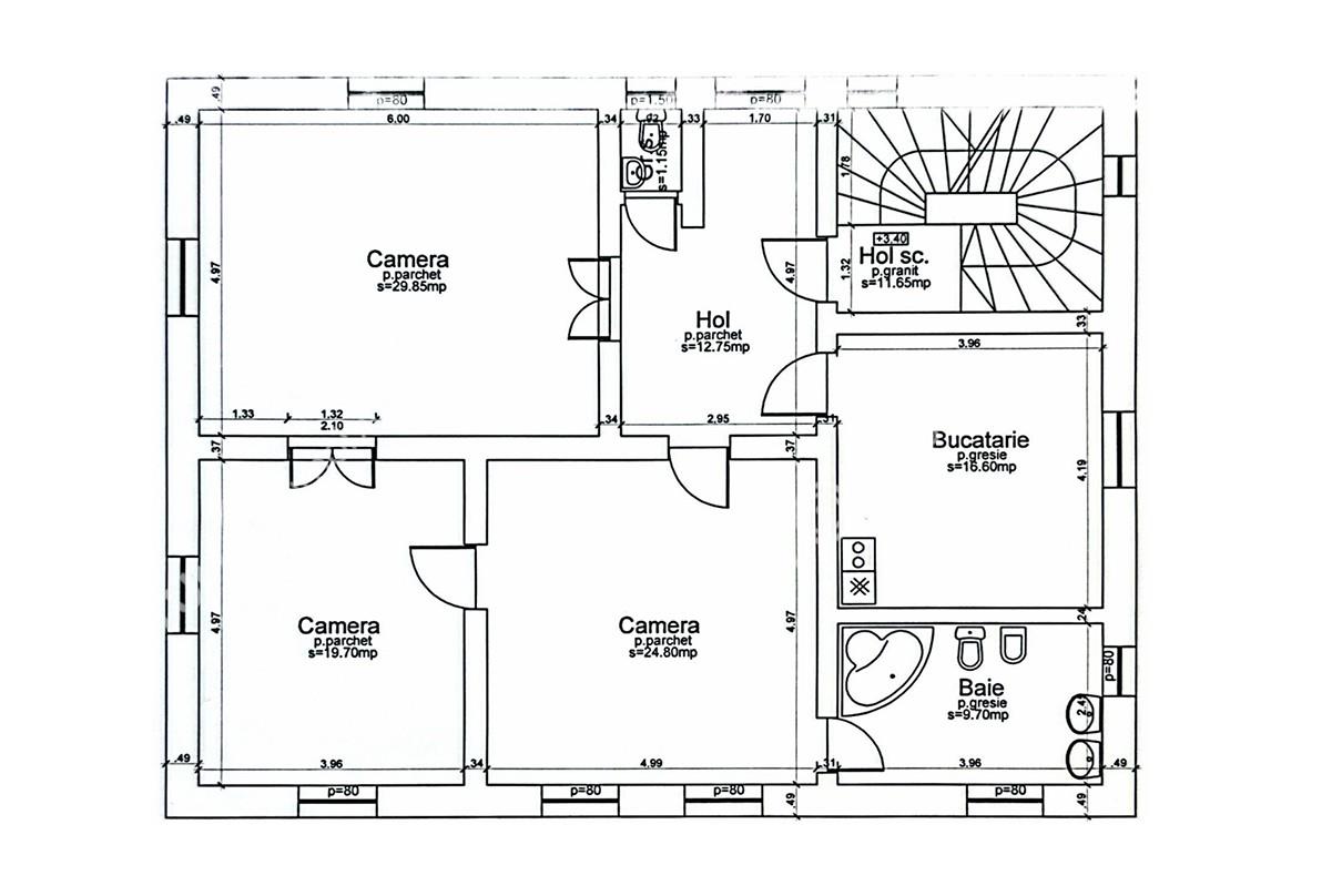 Spatiul masoara 114,55 mp fiind compus din 3 camere de 29,85 mp, 24,80 mp si respectiv 19,70 mp, 2 bai dintre cu suprafete de 9,70 mp si respectiv 1,15 mp ambele dotate cu geam de aerisire si cabina de dus, un hol spatios de 12,75 mp unde poate fi amenajata o receptie sau sala de asteptare si o bucatarie separata de 16,60 mp.